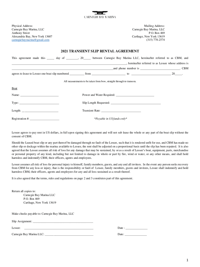 Physical Address: Carnegie Bay Marina, LLC Anthony Street Alexandria Bay, New York 13607 carnegiebaymarina@gmail.comMailing Address: Carnegie Bay Marina, LLC P.O. Box 469 Carthage, New York 13619