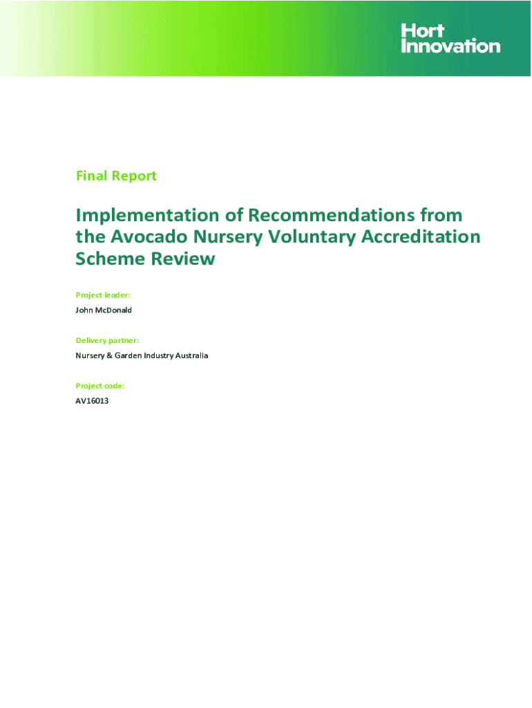FinalReportImplementationofRecommendationsfrom theAvocadoNurseryVoluntaryAccreditation SchemeReview Project leader: JohnMcDonaldDeliverypartner: Nursery&GardenIndustryAustraliaProjectcode: AV16013HortInnovationFinalReportProject: