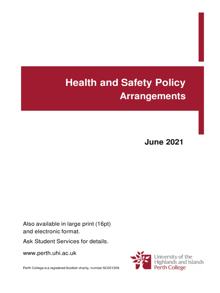 Health and Safety Policy Arrangements June 2021Also available in large print (16pt) and electronic format. Ask Student Services for details. www.perth.uhi.ac.uk Perth College is a registered Scottish