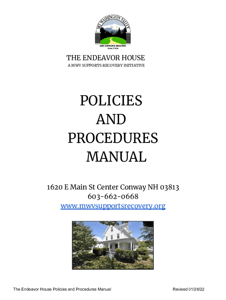 THE ENDEAVOR HOUSE A MTV SUPPORTS RECOVERY INITIATIVEPOLICIES AND PROCEDURES MANUAL 1620 E Main St Center Conway NH 03813 6036620668 www.mwvsupportsrecovery.orgThe Endeavor House Policies and Procedures