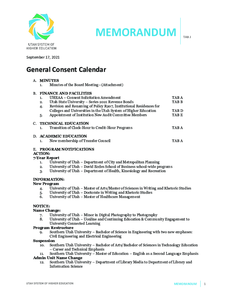 MEMORANDUM September 17, 2021General Consent Calendar A. MINUTES 1. Minutes of the Board Meeting(Attachment) B. FINANCE AND FACILITIES 1. UH EAA Consent Solicitation Amendment 2. Utah State University