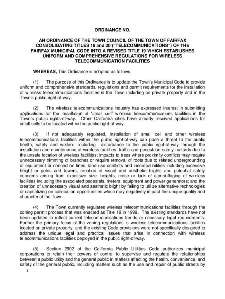 ORDINANCE NO. AN ORDINANCE OF THE TOWN COUNCIL OF THE TOWN OF FAIRFAX CONSOLIDATING TITLES 19 and 20 (TELECOMMUNICATIONS) OF THE FAIRFAX MUNICIPAL CODE INTO A REVISED TITLE 19 WHICH ESTABLISHES UNIFORM