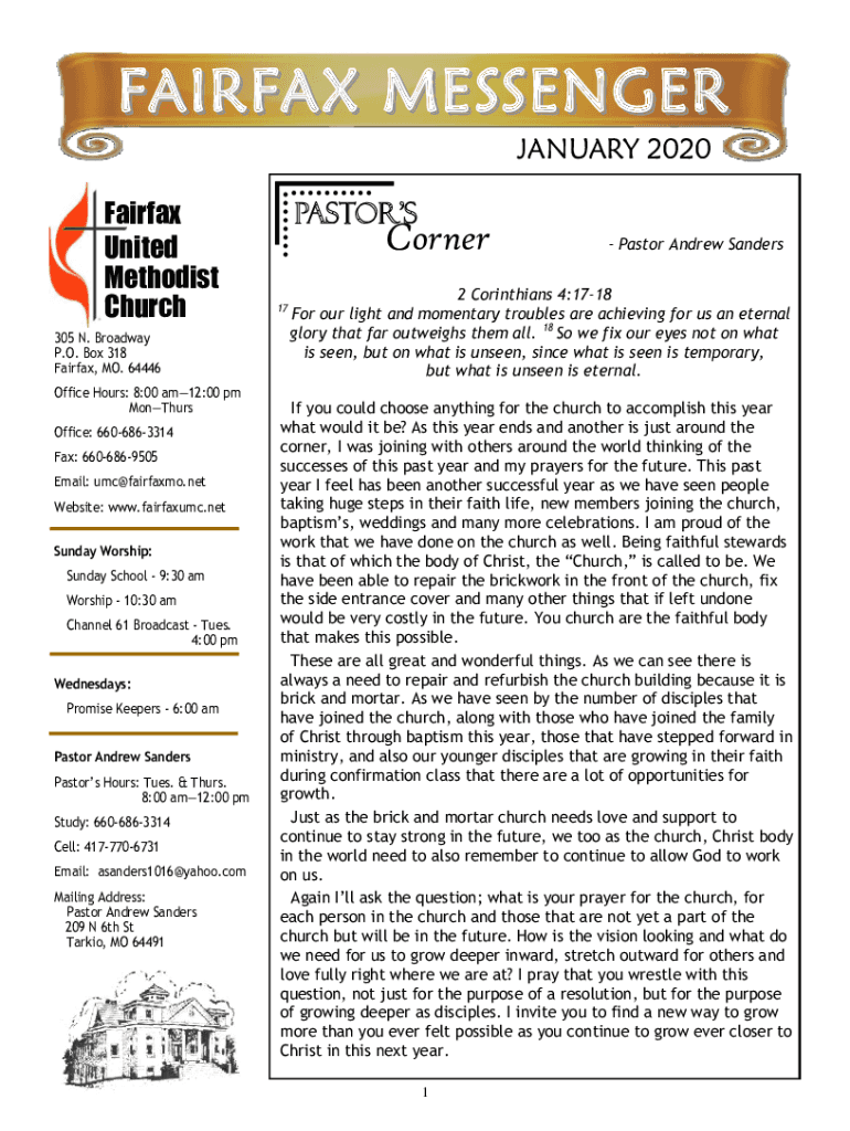 FAIRFAX MESSENGER JANUARY 2020 Fairfax United Methodist Church 305 N. Broadway P.O. Box 318 Fairfax, MO. 64446 Office Hours: 8:00 am12:00 pm Mon Thurs Office: 6606863314 Fax: 6606869505 Email: umc@fairfaxmo.net