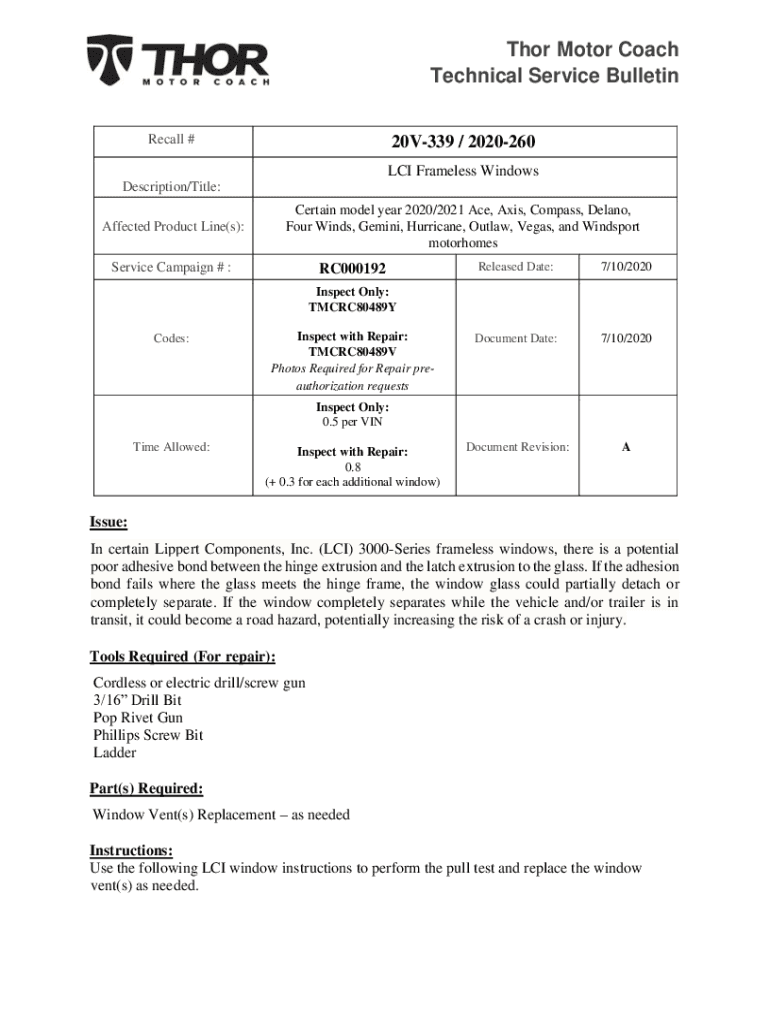 Thor Motor Coach Technical Service Bulletin Recall #20V339 / 2020260 LCD Frameless WindowsDescription/Title: Certain model year 2020/2021 Ace, Axis, Compass, Delano, Four Winds, Gemini, Hurricane,