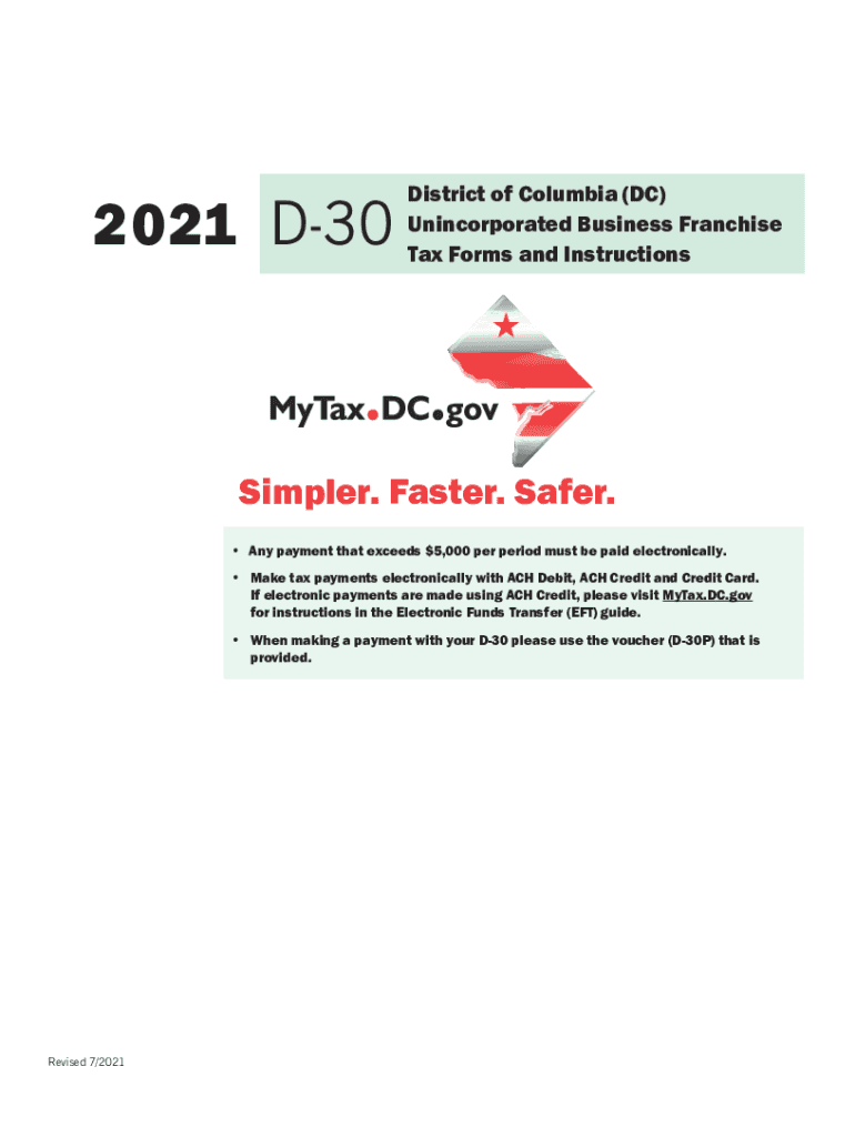 2021 D30District of Columbia (DC) Unincorporated Business Franchise Tax Forms and InstructionsSimpler. Faster. Safer. Any payment that exceeds $5,000 per period must be paid electronically. Make tax