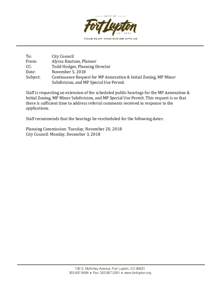 To:From:CC:Date:Subject:City Council Alyssa Knudsen, Planner Todd Hodges, Planning Director November 5, 2018Continuance Request for MP Annexation & Initial Zoning, MP MinorSubdivision, and MP Special