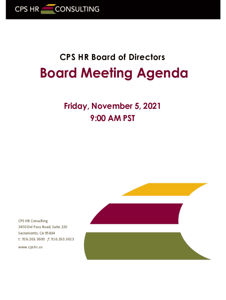 CPS HR Board of DirectorsBoard Meeting Agenda Friday, November 5, 2021 9:00 AM PST CPS HR Consulting 2450 Del Pass Road, Suite 220 Sacramento, CA 95834 t: 916.263.3600 f: 916.263.3613 www.cpshr.usBy