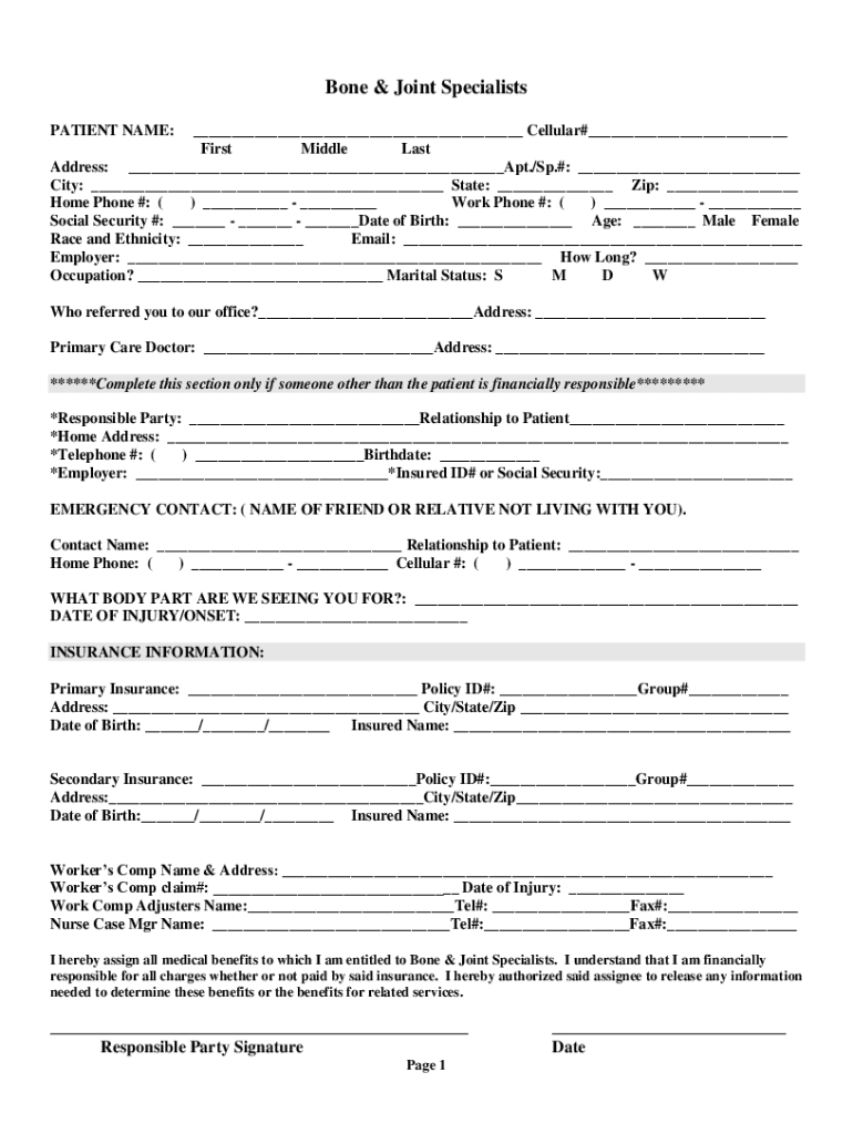 Bone & Joint Specialists PATIENT NAME:___ Cellular#___ First Middle Last Address: ___Apt./Sp.#: ___ City: ___ State: ___ Zip: ___ Home Phone #: () ___ ___ Work Phone #: () ___ ___ Social Security