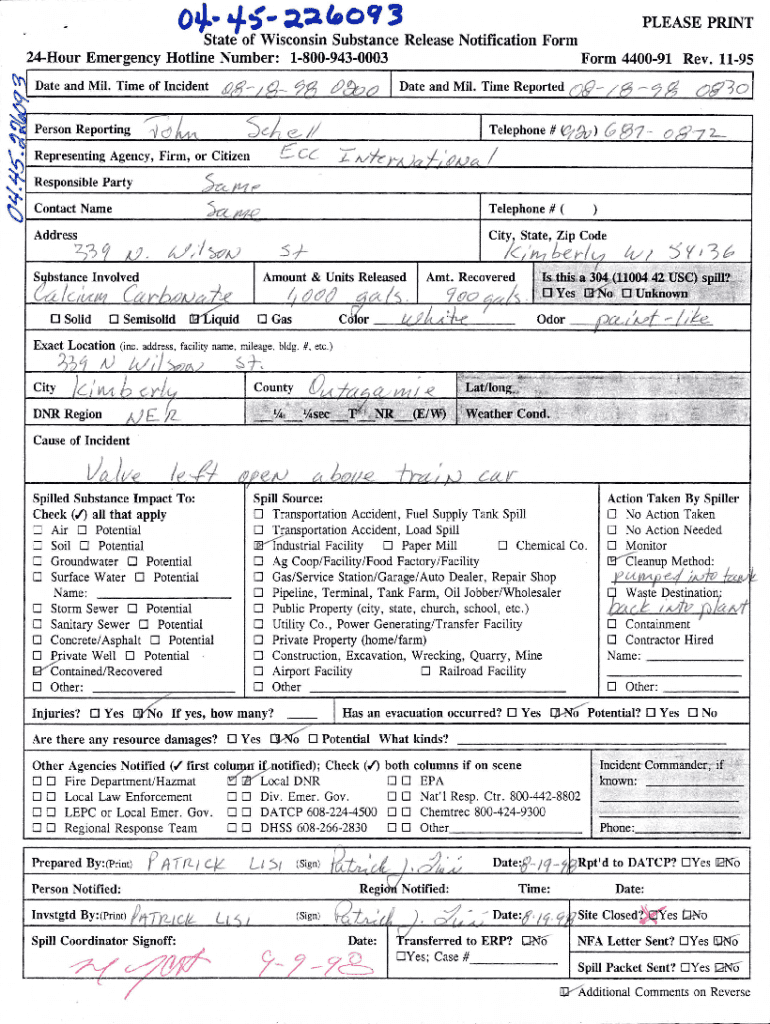 OIL. State./5 ;t:LI. O\'J 3 of Wisconsin Substance Release Notification Form 24Hour Emergency Hotline Number: 18009430003 Date and Mil. Time of Incident Form 440091 Rev. 1195 Date and Mil. Time Reported.)
