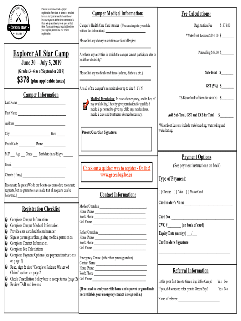 Please be advised that a paper registration form that is faxed or emailed to us is not guaranteed to be entered into our system at the time we receive it, thus not guaranteeing your spot at that time.