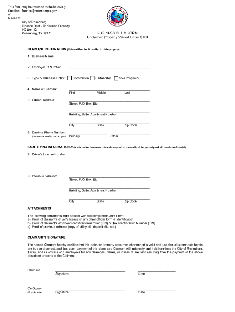 This form may be returned to the following: Email to: finance@rosenbergtx.gov or Mailed to: City of Rosenberg Finance Dept Unclaimed Property PO Box 32 Rosenberg, TX 77471BUSINESS CLAIM FORM Unclaimed