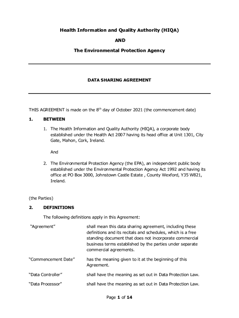 Health Information and Quality Authority (HIA) AND The Environmental Protection AgencyDATA SHARING AGREEMENTS AGREEMENT is made on the 8th day of October 2021 (the commencement date) 1.BETWEEN 1.