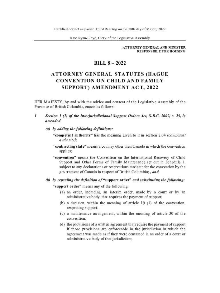 Get the free Bill 8 - Attorney General Statutes (Hague Convention on Child and Family Support) Am...