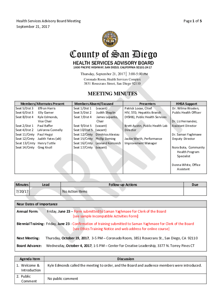Page 1 of 5Health Services Advisory Board Meeting September 21, 2017County of San Diego HEALTH SERVICES ADVISORY BOARD 1600 PACIFIC HIGHWAY, SAN DIEGO, CALIFORNIA 921012417Thursday, September 21,