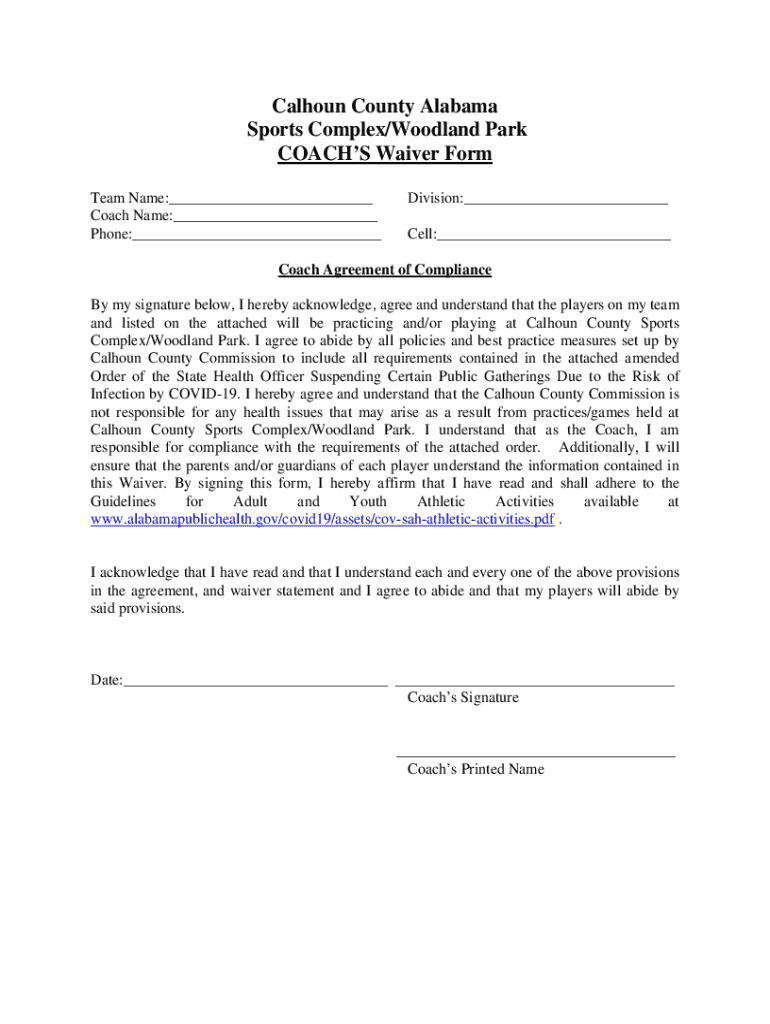 Calhoun County Alabama Sports Complex/Woodland Park COACH Waiver Form Team Name:___ Coach Name:___ Phone:___Division:___ Cell:___Coach Agreement of Compliance By my signature below, I hereby acknowledge,