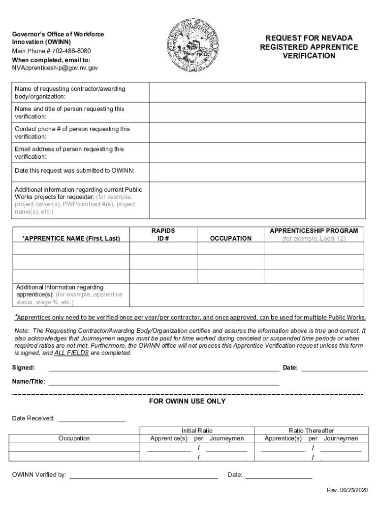 Governors Office of Workforce Innovation (OWING) Main Phone # 7024868080 When completed, email to: NVApprenticeship@gov.nv.govREQUEST FOR NEVADA REGISTERED APPRENTICE VERIFICATIONName of requesting