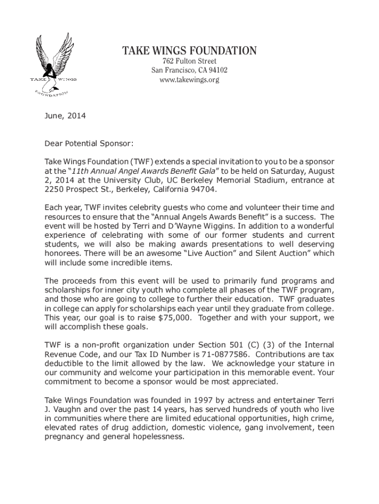 TAKE WINGS FOUNDATION 762 Fulton Street San Francisco, CA 94102 www.takewings.orgJune, 2014 Dear Potential Sponsor: Take Wings Foundation (TWF) extends a special invitation to you to be a sponsor