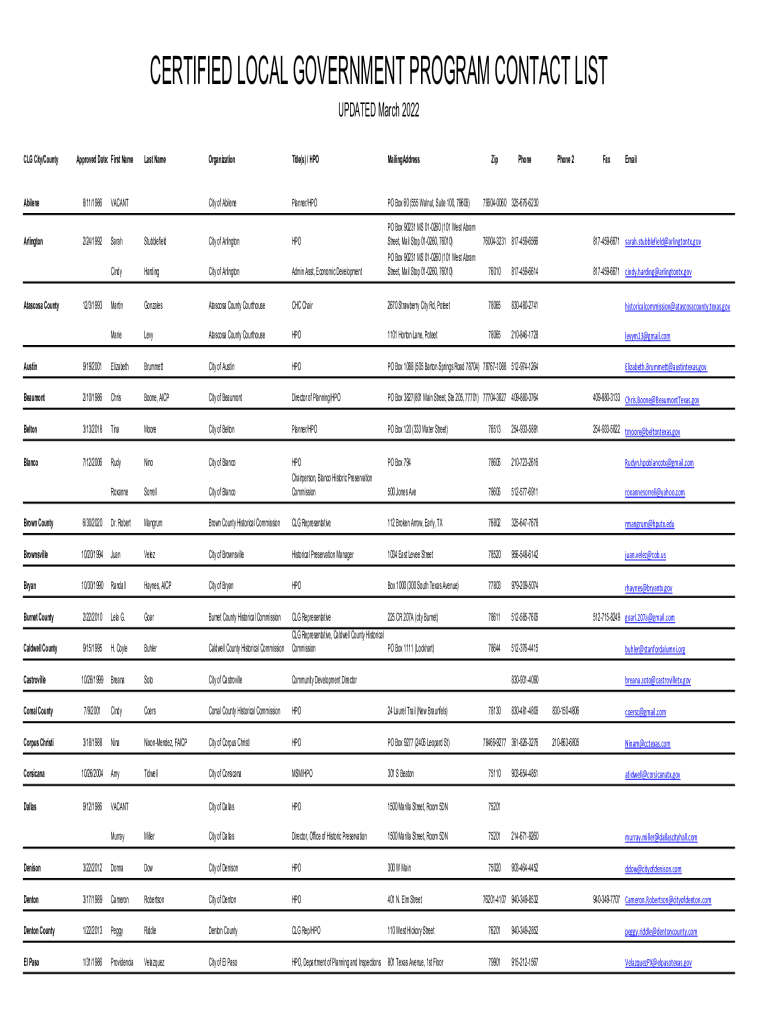 CERTIFIED LOCAL GOVERNMENT PROGRAM CONTACT LIST UPDATED March 2022 CLG City/County Abilene ArlingtonAtascosa CountyApproved Date: First Name8/11/1986 2/24/199212/3/1993Last NameVACANTOrganizationTitle(s)