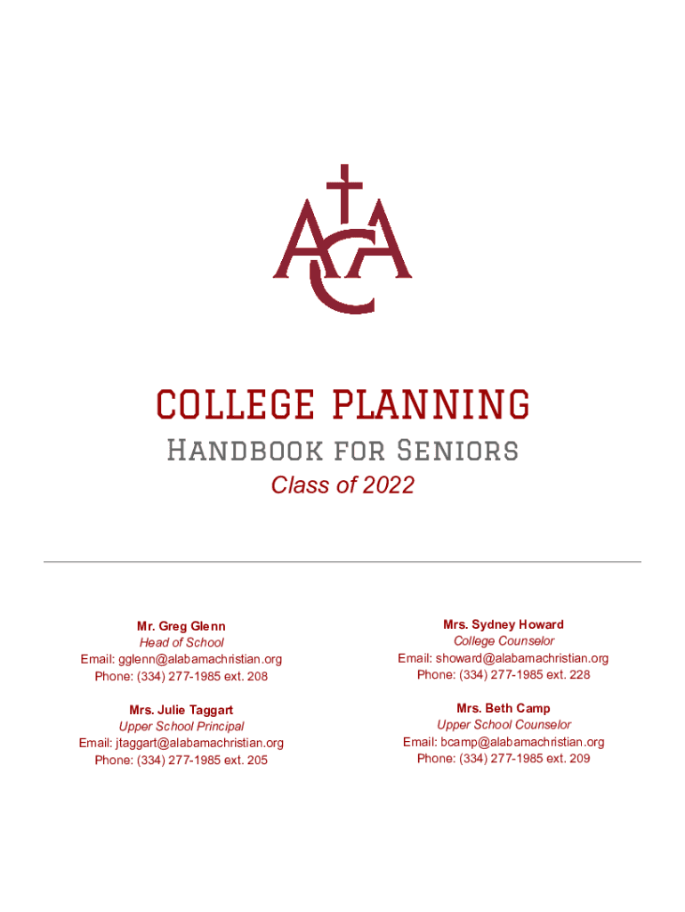 COLLEGE PLANNING Handbook for Seniors Class of 2022Mr. Greg Glenn Head of School Email: gglenn@alabamachristian.org Phone: (334) 2771985 ext. 208Mrs. Sydney Howard College Counselor Email: showard@alabamachristian.org