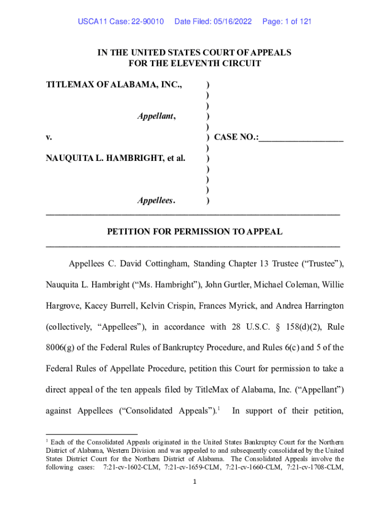 USCA11 Case: 2290010Date Filed: 05/16/2022Page: 1 of 121IN THE UNITED STATES COURT OF APPEALS FOR THE ELEVENTH CIRCUIT TITLE OF ALABAMA, INC.,) )) Appellant, ) ) v.) CASE NO.:___) MARQUITA L. ALBRIGHT,