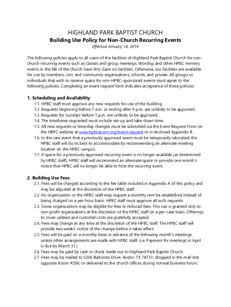 HIGHLAND PARK BAPTIST CHURCHBuilding Use Policy for NonChurch Recurring Events Effective January 14, 2019The following policies apply to all users of the facilities of Highland Park Baptist Church