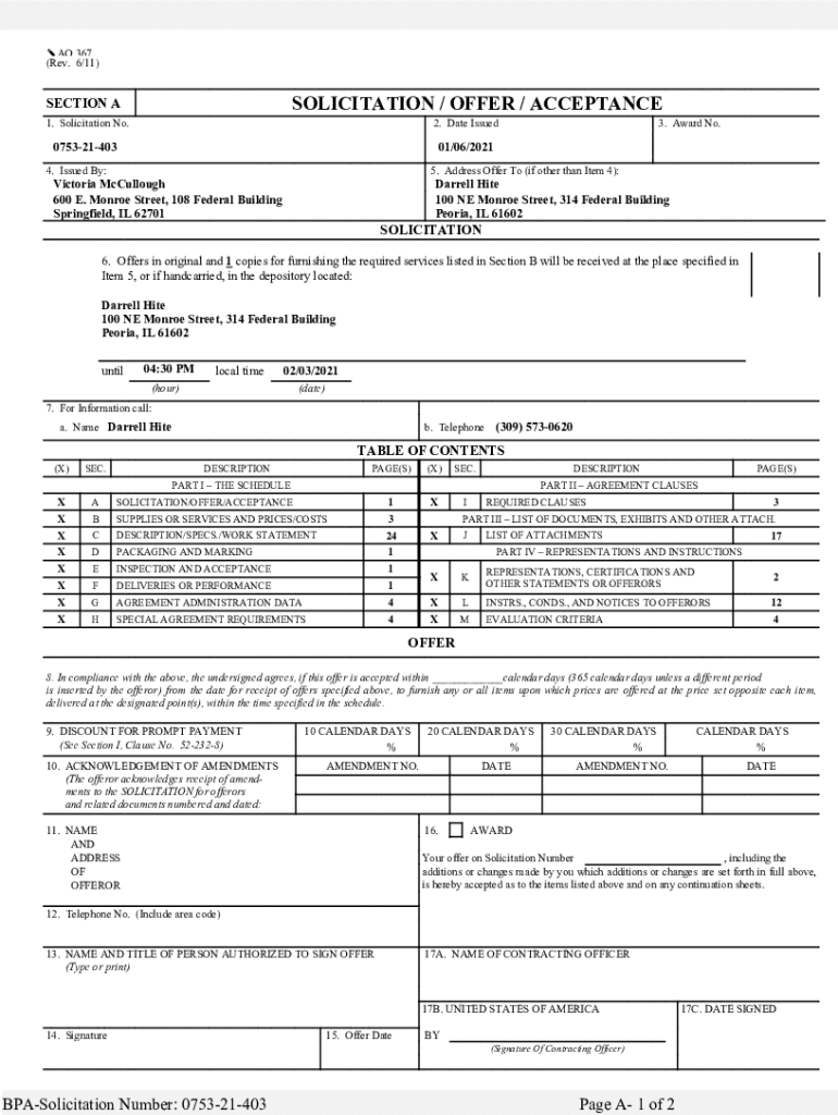 AO 367 (Rev. 6/11)SOLICITATION / OFFER / ACCEPTANCESECTION A 1. Solicitation No.2. Date Issued07532140301/06/20214. Issued By:3. Award No.5. Address Offer To (if other than Item 4):Victoria McCullough