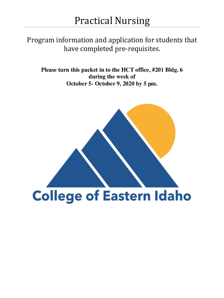 Practical Nursing Program information and application for students that have completed prerequisites. Please turn this packet in to the HCT office, #201 Bldg. 6 during the week of October 5 October