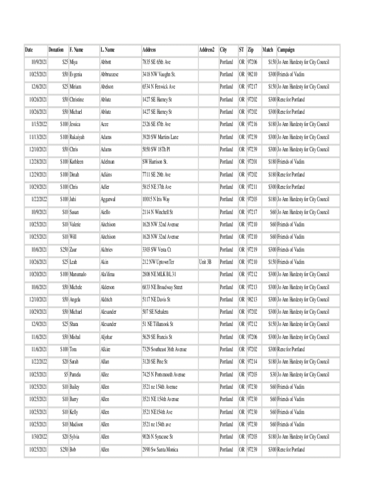 Date. NameAddress$25 MiyaAbbott10/25/$202150 Evgenia12/6/202110/9/2021DonationF. NameAddress2CityST ZipMatchCampaign7835 SE 65th AvePortlandOR $97206150 Jo Ann Hardest for City CouncilAbbruzzese3418