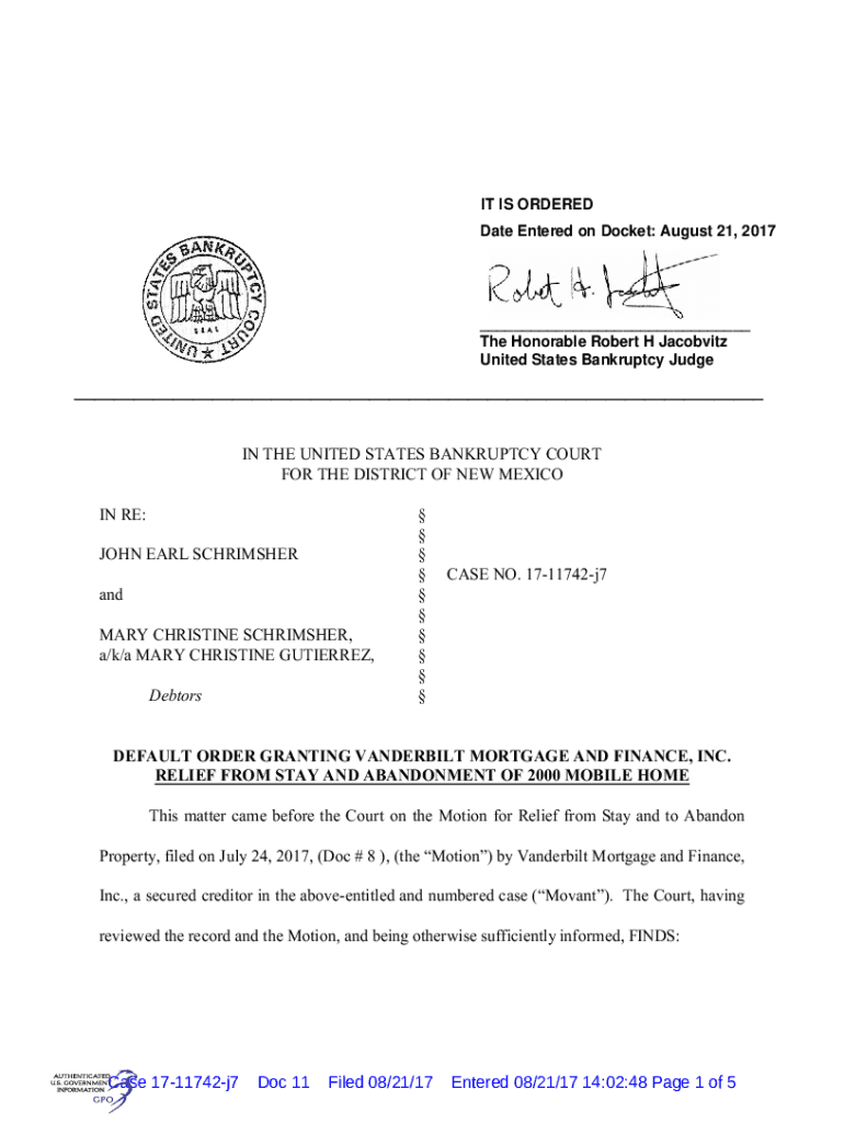 IT IS ORDERED Date Entered on Docket: August 21, 2017___ The Honorable Robert H Jacobite United States Bankruptcy Judge___IN THE UNITED STATES BANKRUPTCY COURT FOR THE DISTRICT OF NEW MEXICO IN RE: