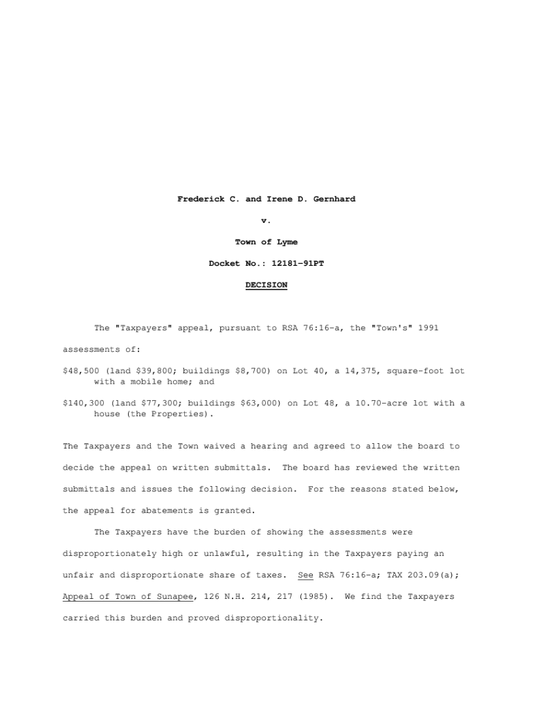 Frederick C. and Irene D. Bernhard v. Town of Lyme Docket No.: 1218191PT Decision \” Taxpayers\” appeal, pursuant to RSA 76:16a, the \” Town\'s\” 1991 assessments of: $48,500 (land $39,800;