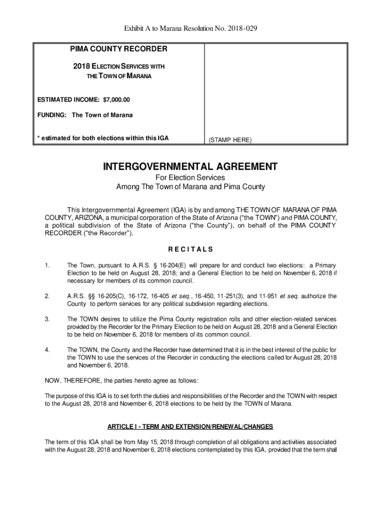 Exhibit A to Marina Resolution No. 2018029 PIMA COUNTY RECORDER 2018 ELECTION SERVICES WITH THE TOWN OF MARINA ESTIMATED INCOME: $7,000.00 FUNDING: The Town of Marina* estimated for both elections