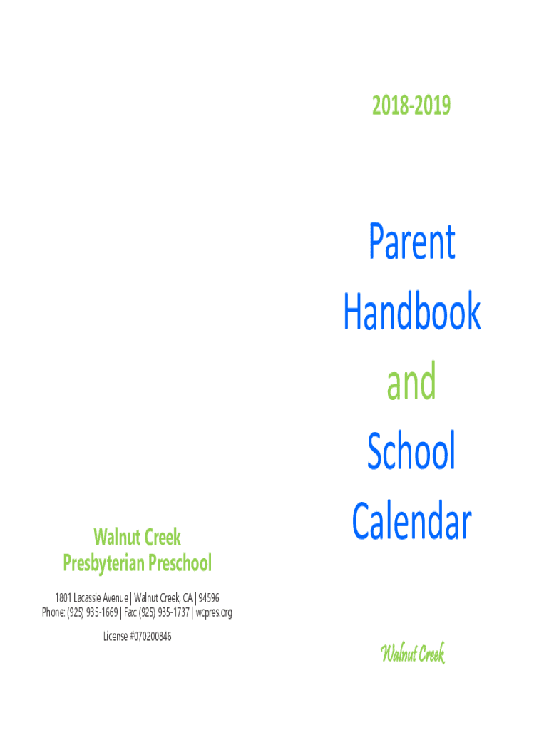 20182019Walnut Creek Presbyterian PreschoolParent Handbook and School Calendar1801 Cassie Avenue | Walnut Creek, CA | 94596 Phones: (925) 9351669 | Fax: (925) 9351737 | acres.org License #070200846Walnut