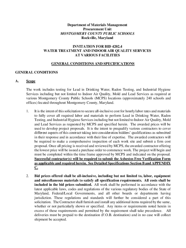 Department of Materials Management Procurement Unit MONTGOMERY COUNTY PUBLIC SCHOOLS Rockville, Maryland INVITATION FOR BID 4202.4 WATER TREATMENT AND INDOOR AIR QUALITY SERVICES AT VARIOUS FACILITIES