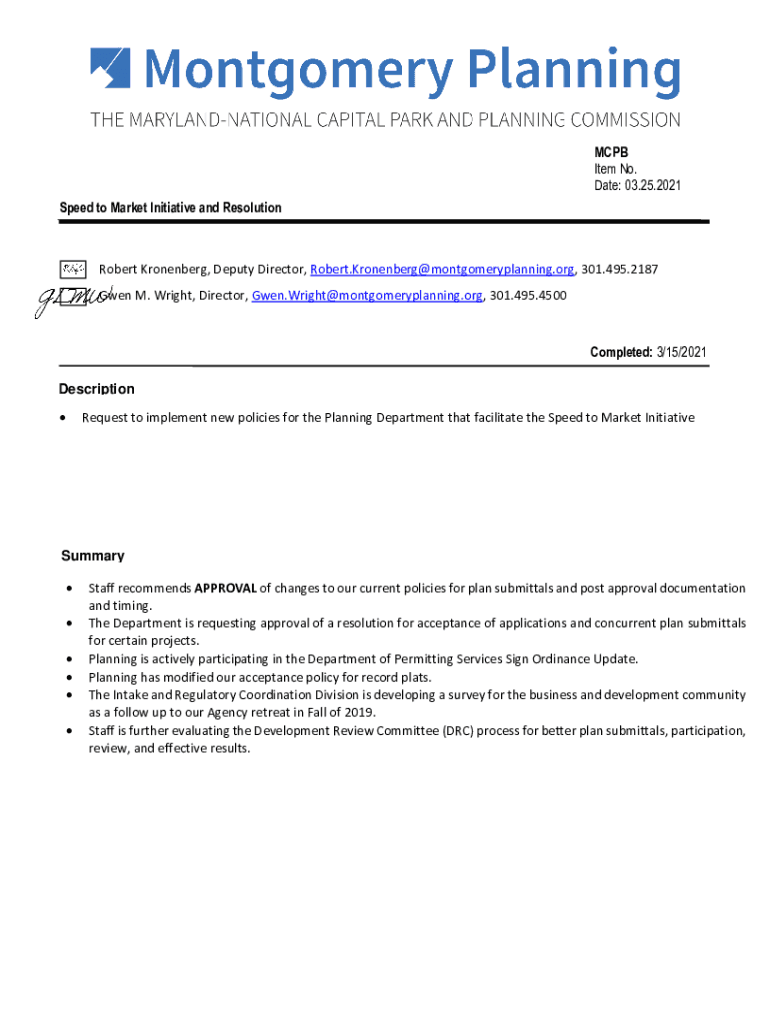 MCP Item No. Date: 03.25.2021 Speed to Market Initiative and Resolution Robert Rosenberg, Deputy Director, Robert.Kronenberg@montgomeryplanning.org, 301.495.2187 Gwen M. Wright, Director, Gwen.Wright@montgomeryplanning.org,