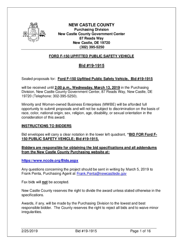 NEW CASTLE COUNTY Purchasing Division New Castle County Government Center 87 Reads Way New Castle, DE 19720 (302) 3955250 FORD F150 UNFITTED PUBLIC SAFETY Vehicle #191915 Sealed proposals for: Ford