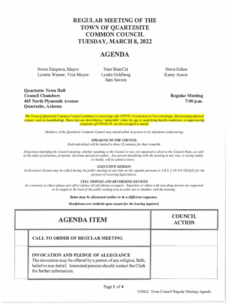 REGULAR MEETING OF THE TOWN OF QUARTZITE COMMON COUNCIL TUESDAY, MARCH 8, 2022AGENDA Norm Simpson, Mayor Loretta Warner, Vice Mayor Starr Erect Lynda Goldberg Sam SaxtonSteve Sc hue Kara AmonQuartzsite