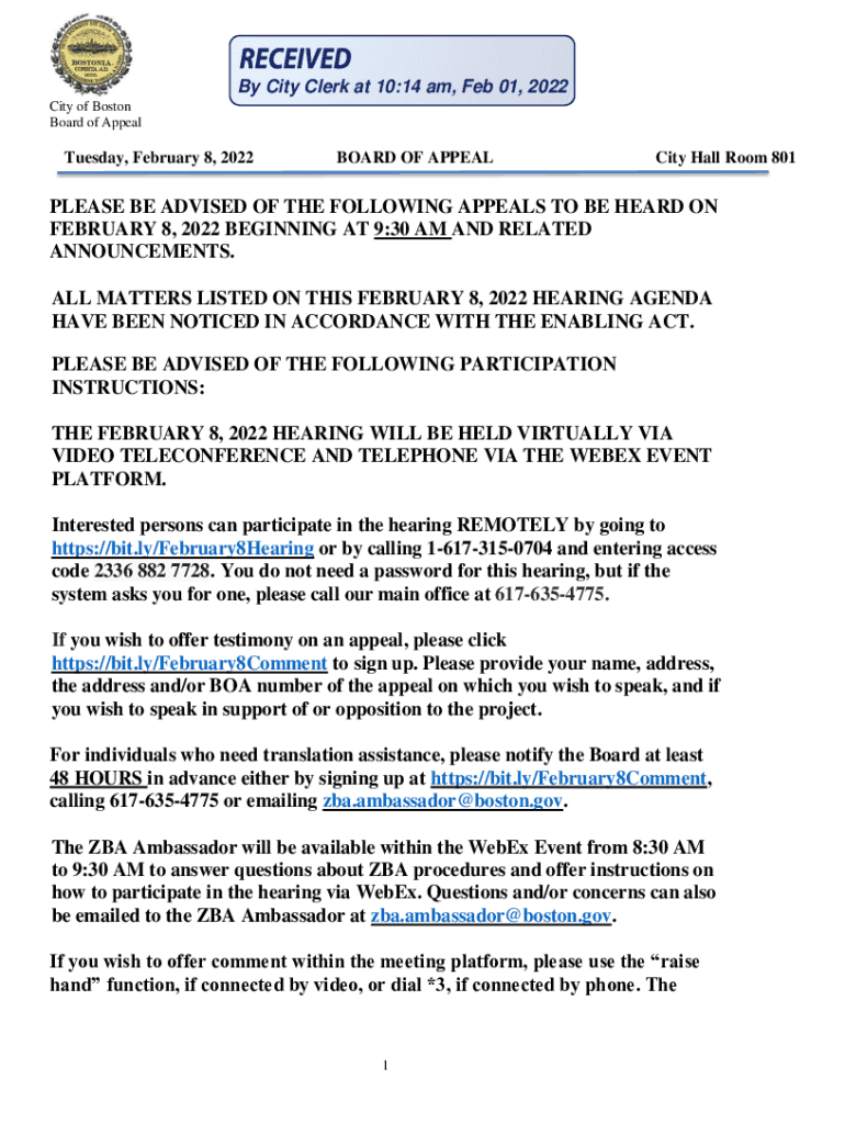 By City Clerk at 10:14 am, Feb 01, 2022 City of Boston Board of Appeal Tuesday, February 8, 2022BOARD OF Appealing Hall Room 801PLEASE BE ADVISED OF THE FOLLOWING APPEALS TO BE HEARD ON FEBRUARY 8,