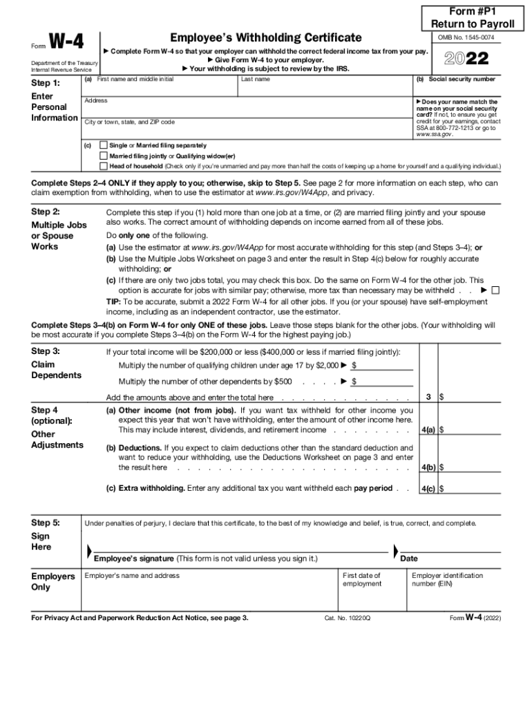 Former #P1 Return to PayrollW4Employees Withholding Certificate Department of the Treasury Internal Revenue Services 1: Enter Personal Information OMB No. 15450074Complete Form W4 so that your employer
