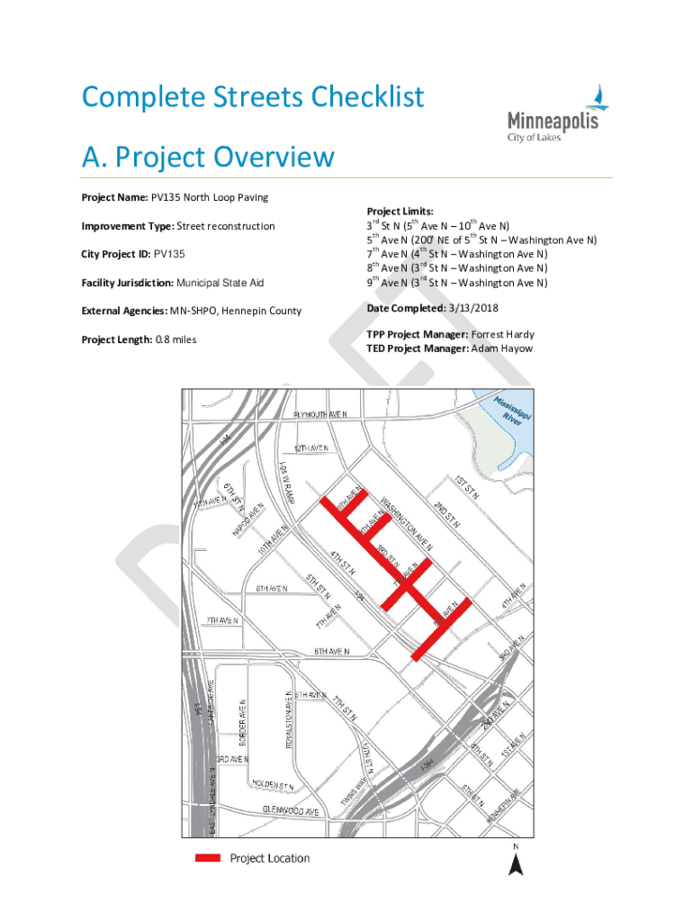Complete Streets Checklist A. Project Overview Project Name: PV135 North Loop PavingFacility Jurisdiction: Municipal State Project Limits: rd TH 3 St N (5 Ave N 10 Ave N) TH 5 Ave N (200 NE of 5 St