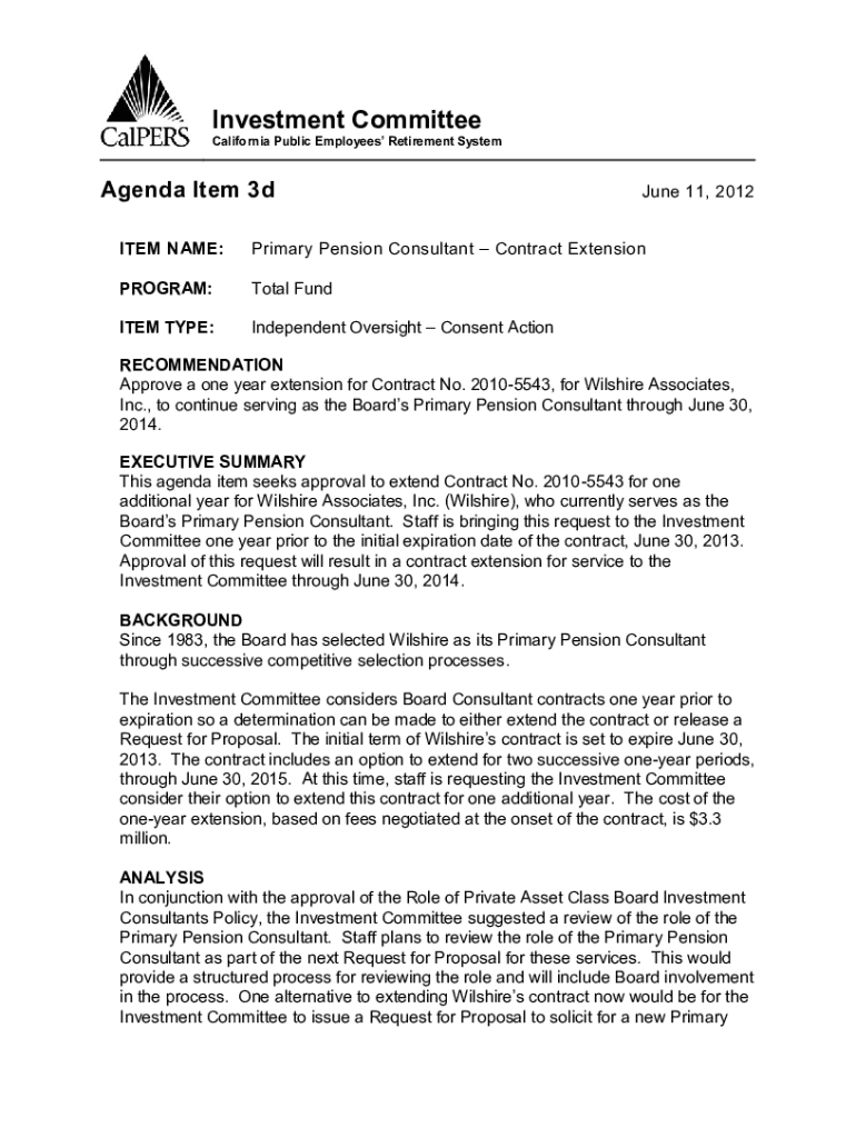 Investment Committee California Public Employees Retirement SystemAgenda Item 3dJune 11, 2012ITEM NAME:Primary Pension Consultant Contract ExtensionPROGRAM:Total Funding TYPE:Independent Oversight