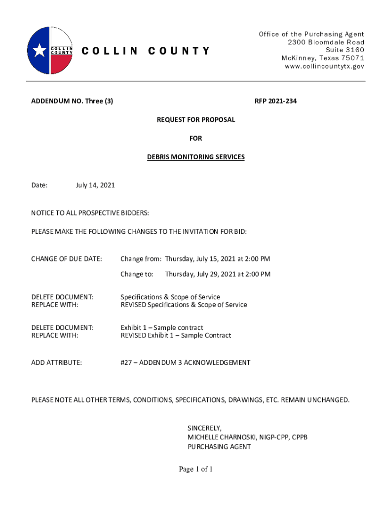 COLLIN COUNTY ADDENDUM NO. Three (3)Office of the Purchasing Agent 2300 Bloom dale Road Suite 3160 McKinney, Texas 75071 www.collincountytx.govRFP 2021234 REQUEST FOR PROPOSAL FOR DEBRIS MONITORING