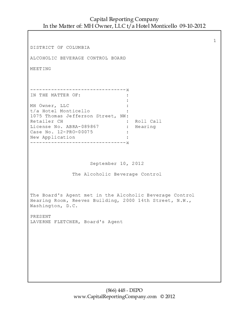 Capital Reporting Company In the Matter of: MH Owner, LLC t/a Hotel Monticello 09102012 1 DISTRICT OF COLUMBIA ALCOHOLIC BEVERAGE CONTROL BOARD Meeting IN THE MATTER OF: : : MH Owner, LLC : t/a Hotel