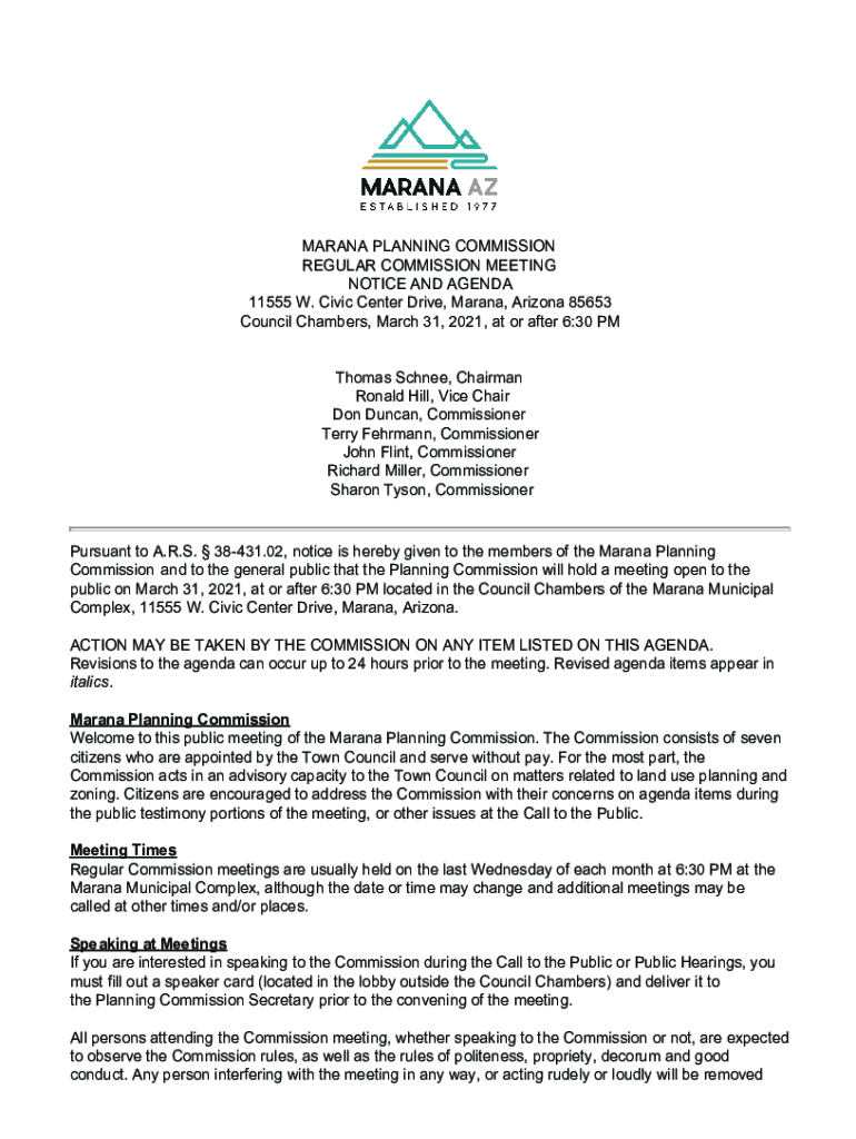 MARANAPLANNINGCOMMISSION REGULARCOMMISSIONMEETING NOTICEANDAGENDA 11555W. CivicCenterDrive, Marina,Arizona85653 Council Chambers,March31,2021,atorafter6:30PMThomasSchnee,Chairman Ronald Hill, Timeshare