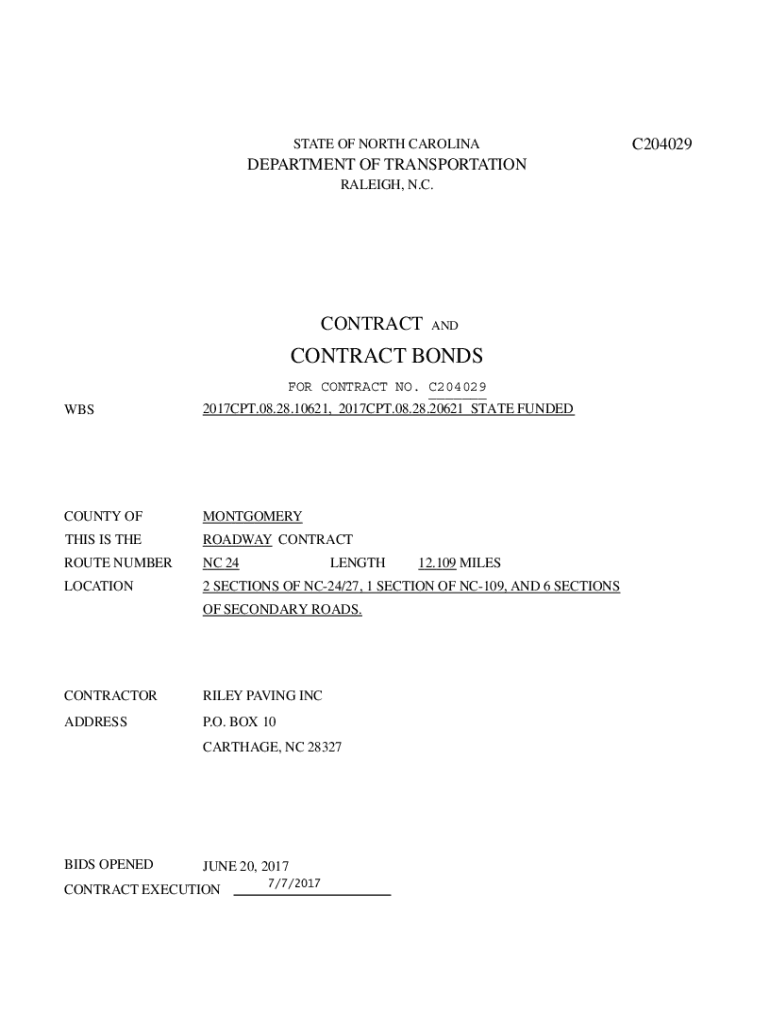 STATE OF NORTH CAROLINADEPARTMENT OF TRANSPORTATION RALEIGH, N.C.CONTRACTANDCONTRACT BONDS FOR CONTRACT NO. C204029 ___ 2017CPT.08.28.10621, 2017CPT.08.28.20621 STATE FUNDEDCOUNTY OFMONTGOMERYTHIS