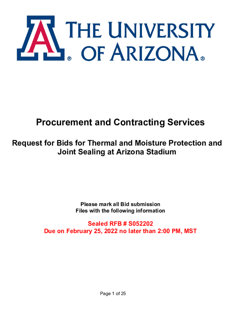 Procurement and Contracting Services Request for Bids for Thermal and Moisture Protection and Joint Sealing at Arizona StadiumPlease mark all Bid submission Files with the following informationSealed