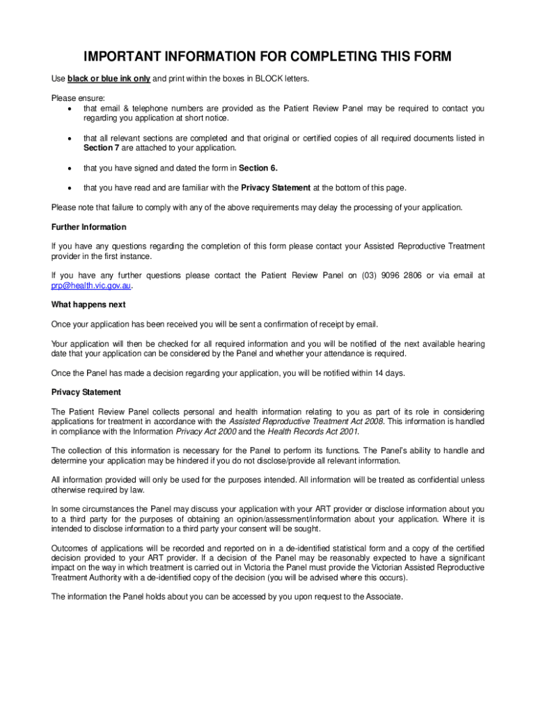 IMPORTANT INFORMATION FOR COMPLETING THIS FORM Use black or blue ink only and print within the boxes in BLOCK letters. Please ensure: that email & telephone numbers are provided as the Patient Review