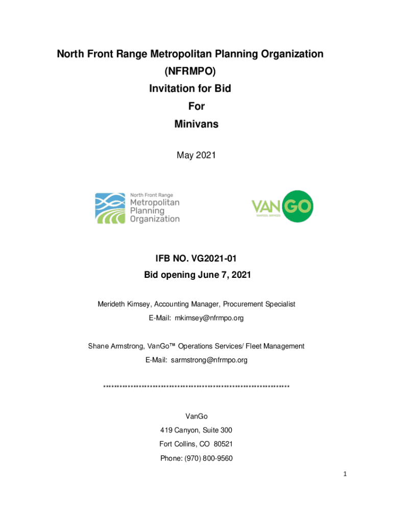 North Front Range Metropolitan Planning Organization (NORMAL) Invitation for Bid For Minivans May 2021IFB NO. VG202101 Bid opening June 7, 2021, Meredith Kinsey, Accounting Manager, Procurement Specialist