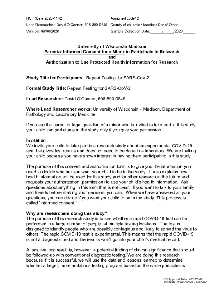 HS IRS #:20201142Assigned code/ID: ___Lead Researcher: David O'Connor; 6088900845 County of collection location: Dane/ Other ___ Version: 09/08/2020Sample Collection Date:___/___/2020___University