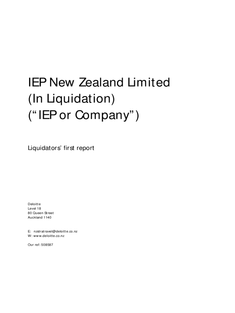 IEP New Zealand Limited (In Liquidation) (IEP or Company) Liquidators first reportDeloitte Level 18 80 Queen Street Auckland 1140E: nzstratravel@deloitte.co.nz W: www.deloitte.co.nz Our ref: 508587Restrictions
