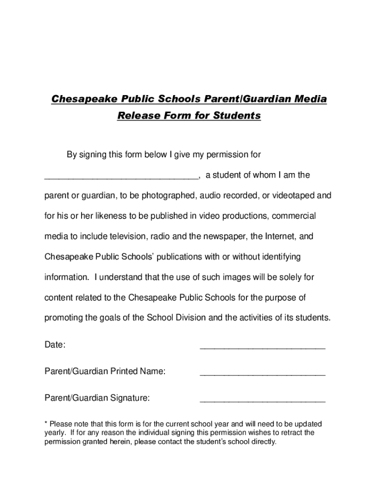 Chesapeake Public Schools Parent/Guardian Media Release Form for Students signing this form below I give my permission for ___, a student of whom I am the parent or guardian, to be photographed, audio
